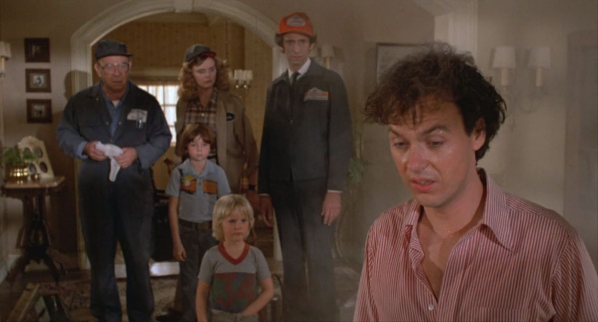 Later on he tries to do the laundry. He overloads the machine with detergent and it judders ominously, before exploding. A TV repair person, a pest control person, and a plumber all arrive at roughly the same time and compete for his attention while he runs around trying to keep his children alive and his house intact. He succeeds, but only just.
